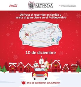 CD.REYNOSA,TAM.-10/12/2021.-El R. Ayuntamiento que encabeza el Presidente Municipal Carlos Peña Ortiz, invita a las familias a disfrutar del desfile navideño, este viernes 10 de diciembre, saliendo a partir de las 6:00 p.m. de plaza Sendero Periférico y concluyendo con el festival artístico Navideño en el polideportivo.