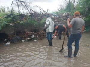 Cd. Rìo Bravo,Tam.-01/06/2021.-Personal de Protección Civil Bomberos en Río Bravo, recorre los puntos pluviales, verificando que el agua provocada por las lluvias siga su cauce natural, retirando la basura y objetos que lo impidan.
